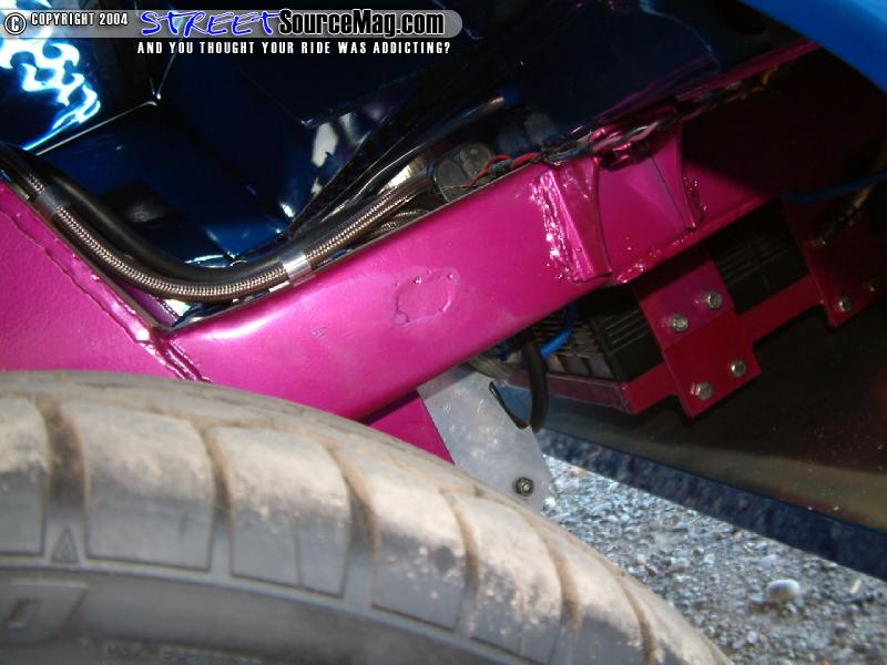 Getting things going Devin would handle most all the work on his own time. First on his list would be to fill 280 factory holes on the frame along with sectioning the rear of the frame and notching it for the rear axle clearance. Next the frame would be powder coated purple for the full frame off appeal.