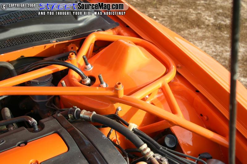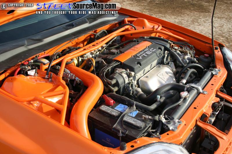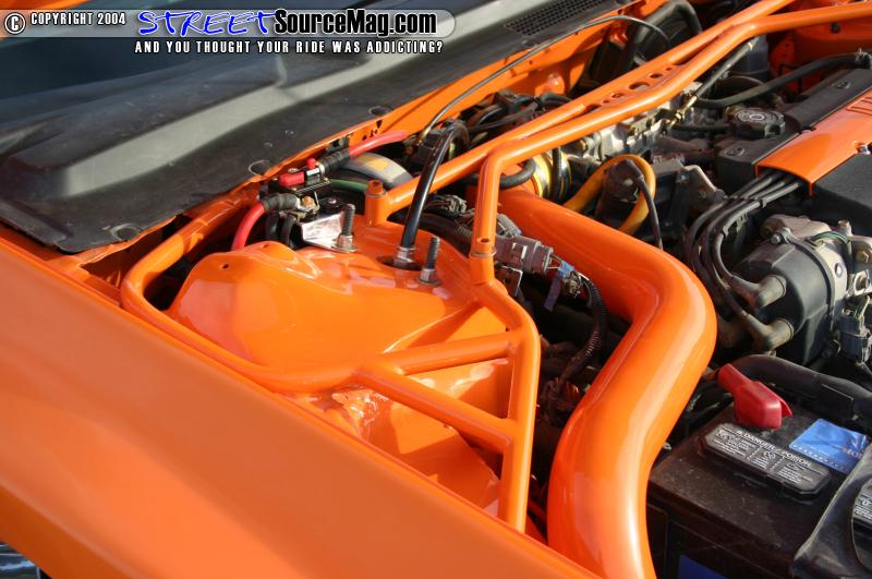 To get him where he needs to go in a hurry the 2.2L Prelude motor was given some basic upgrades. A cold air intake and 2 2 ½” HKS mufflers provide the go, while a tube setup and clean dressed up motor accessories provide the show.