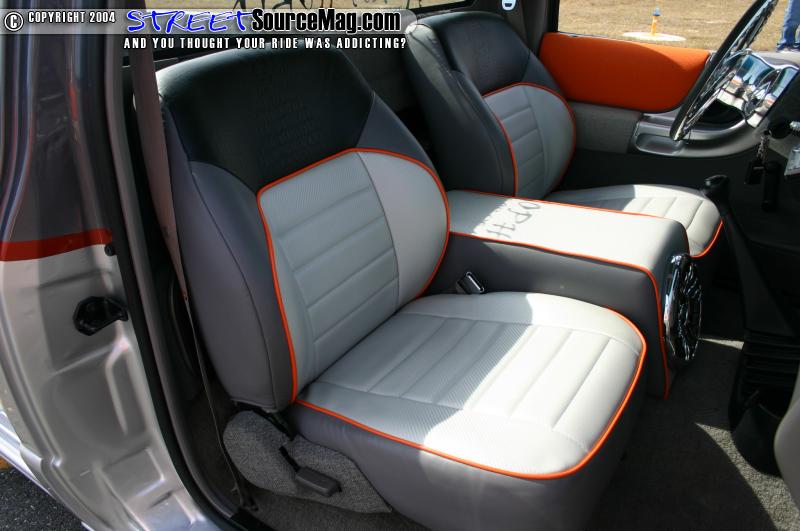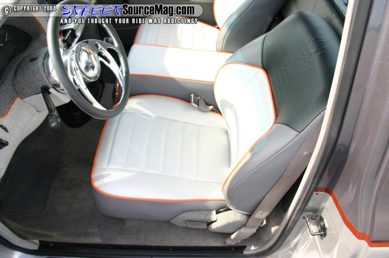 The seats were custom fabricated by Ken. What he did was create a custom low back seat with the top half being Escort seats, and the bottom half being Ranger seats. The seats where then wrapped by Larry’s Trim in carbon fiber silver, gator shine leather, gray vinyl, and finished off with orange piping. The steering wheel was replaced with a Billet Specialties billet wheel, and the mirror was replaced with a billet-milled mirror. A Kenwood head unit, Rockford Fostgate subs, and Blaupunkt mids and tweets provide the sound. Audiobahn and Blaupunkt amps power the system.