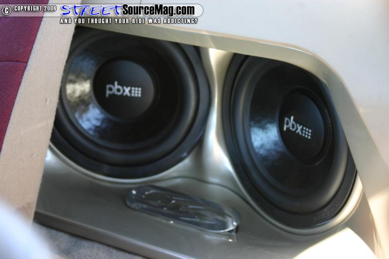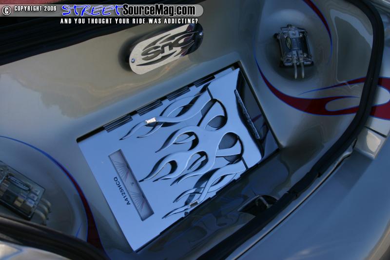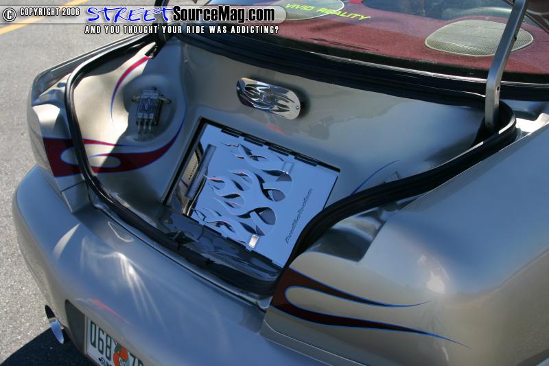 The seats were wrapped in tan leather and burgundy tweed to flow with the rest of the interior. Scrape-N-Customs set Fleet up with the Clarion 7” TV, Audiobahn speakers, and PBX 12” subs. These where all powered by Audiobahn amps. The subs and amps were fit into a custom fiberglass box built into the trunk of Fleets Sebring.