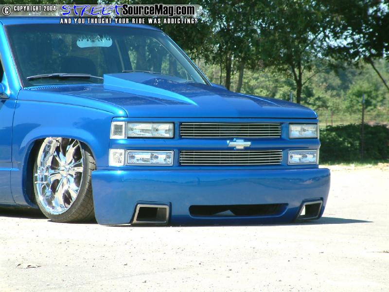 Starting with the exterior of the truck the hood was swapped out for a Harwood Fiberglass hood with a 4” cowl on it. Up next the grille was updated with a 98 Silverado shell and finished off with a billet grille. The bumper was tossed and a 2004 Chevy Silverado SS bumper was converted to fit onto Justin’s truck.
