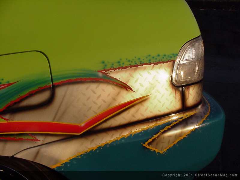 To get the civic started, Tony decided that many stock items needed to accompany the trash. For beginners, Tony along with help from fellow club member, John Helzer, began by shaving many items. The first to go would be the four door handles. To accompany the handles in the trash, the emblems, squirters, inner taillights along with the license plate box would also be removed. With the new sheet metal in place, it was then left to Zach Fullmer to block sand the entire civic and prep it for paint. Now ready for paint, Tony turned to "Airbrush" Chris of Boise Idaho, for his graphics expertise. After laying down the base Parrot Green PPG paint, Airbrush then got busy applying the various mixtures of PPG colors.