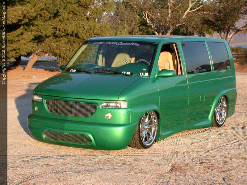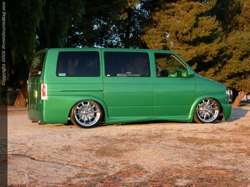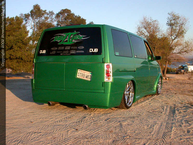To bring vision out during the night, a set of PIAA lights mounted into the front bumper would help the stock headlight assembly. With the bodywork and new panels added and complete, it was time for Ernest to have the crew at Liberty Body Shop of Los Angeles to lay down the paint of chose. Utilizing BASF (RM) paint, the Van would be painted a 3AM green along with a set of ghost flames to help bring things alive. With the exterior complete it was time to work the suspension. With running a set of 20x8.5 Weld Racing Evo Axis 5 wheels wrapped in 245-35-20 Toyo Tire Proxes, it would take a nice suspension set up to bring the body kit down closer to the ground. Starting in the rear, the frame rails would be notched and boxed by Sport Truck Specialty of Carson, CA, leaving more room for rear travel.