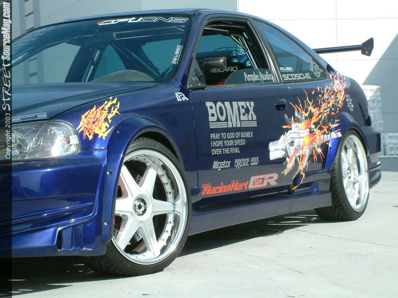 Once the car was striped of the masking tape and buffed to a high gloss, TG Graphics applied Bomex JDM Graphics to the car. To add to the exterior attire a Corvis Aluminum wing and APR Formula 3 carbon fiber mirrors were installed. To ensure proper lighting at night a set of Phillips HID conversions were installed.