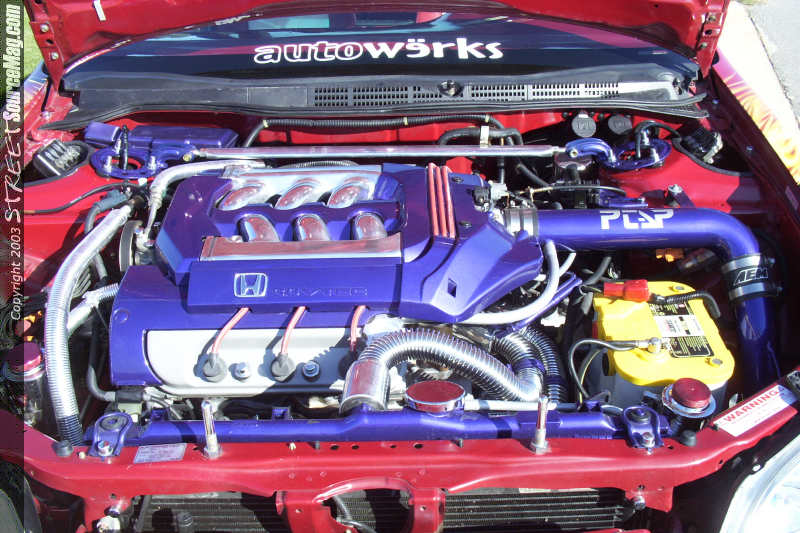 Turning his attention to the engine compartment Justin noticed it was lacking the same luster as the exterior and interior. So he polished the intake manifold, custom painted several items and then added an AEM cold air intake. To replace the nasty stock hoses, Cool Flex hoses were then added for coolant circulation functions. To ensure the proper fire power reached the motor a set of Magnecor plug wires were added. A Comptech header backed up by an all polished stainless steel 2 ½" exhaust with a polished cat and a pair of Greddy polished mufflers were added to ensure the Accord was not all show and no go.