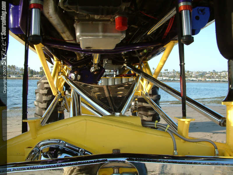 The cage also provides the mounting locations for the chrome-plated "The Edge" Donahoe Racing Enterprises link bars with 1-ΒΌ heim joints. The front is equipped with a triangulated four-link and the rear is fitted with a triangulated two-link system. There was even enough room left over for the 4 Optima yellow top batteries to straddle the transfer case.
