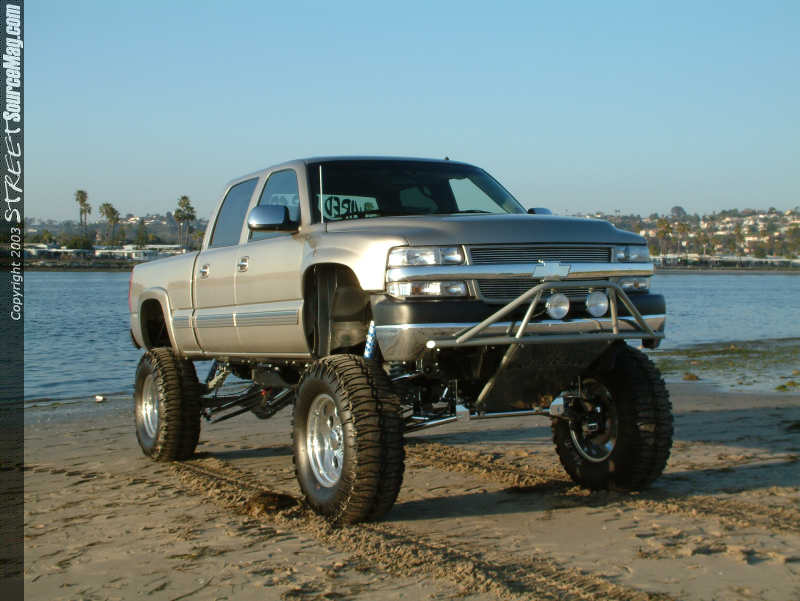 With purchasing his all new Chevy 2599 HD for $32,000 back on April 11th of 2001 along with dishing out another $50,000 into the build up, it would take 1 year to build and would be found complete on June 15th of 2002. The reason Adam decided to build this ride was as a shop vehicle showing off their skills. Adam has previously built an 85 Blazer and a '84 1500 but felt that this would be his pride. After became involved in the scene when he opened up his shop 12 years ago, the skills are found better as the years go on. Adam's decision to keep things simple would pay off. Starting upfront a Billet Stoll grille would be installed along with Pewter painted brush guard and chromed out cover. In the guard you will find a set of lights mounted up for those late night 4x4 adventures. Next the stock front fenders would be thrown to the side and a set of Glass Works Fiber fenders, with a Pre-runner look would be bolted in their place. The stock door handles would then be removed and a set off of an Escalade would be found bolted in along with a set of 2003 Chevy taillights in the rear.  | Everything with this truck is very clean, not even a spot of dirt in the wheel wells! |