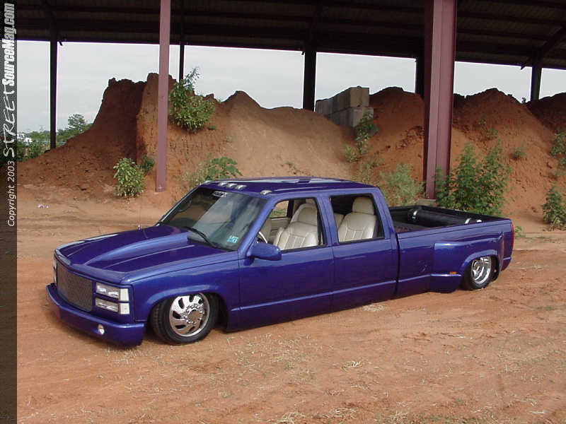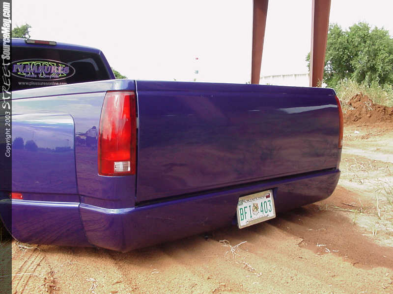Moving back, the door handles would be shaved on all 4 doors along with welding in a Chassis Tech roll pan and molding in the tailgate. A hard shell bed cover would be installed to finish things off out back.   With the body work complete and the prep work done, the Dually was taken to Norman Body works of Norman, OK. While in their hands, they would lay down the Acura Supersonic blue paint.