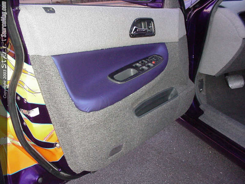 The dash also received matching tweed, complete with the Negative Camber logo stitched masterfully onto the top of the dash. The headliner also received custom graphics utilizing graphite and grey tweed. The door panels were removed and restitched using matching tweed as well as illumina purple inserts.