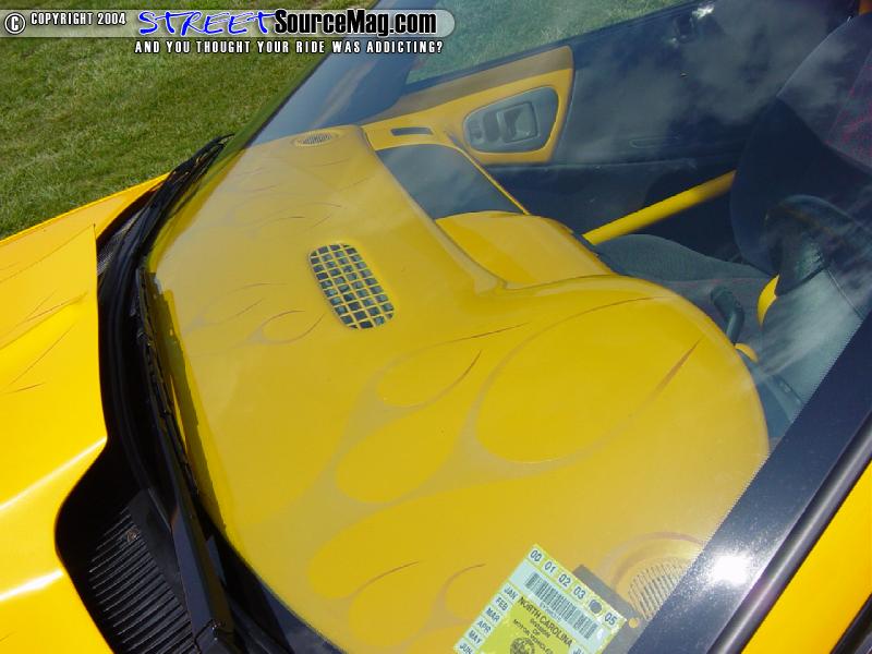 With an exterior like that, it was necessary to have an interior that wouldn't look out of place. Brandon pulled out the dash, center console and tops of the door panels and sanded them down smooth and sprayed the same yellow with gold pearl paint as the exterior.  He also had matching ghost flames sprayed on the top of the dash. Now for what makes this interior stand out is the full frame-to-frame roll bar.