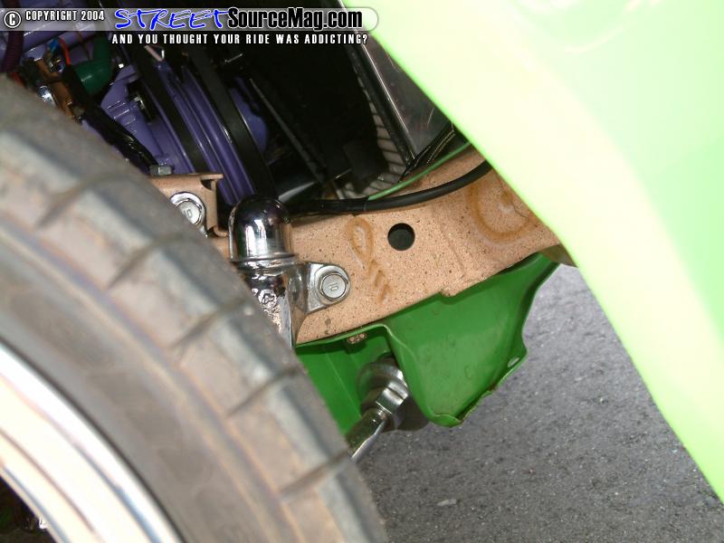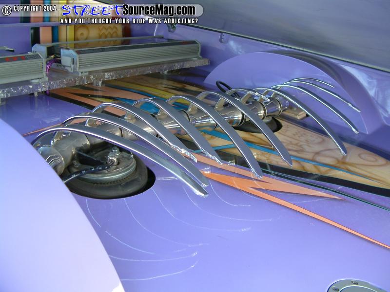 The air system is kept with air via two 450c Viar compressors. Many of the chassis components were then powder coated by Chuck at Performance Coatings of Oklahoma City while all other items where chrome plated by Ramos Coatings. The frame is also found to have many hieroglyphics to match the over all theme of the build up.