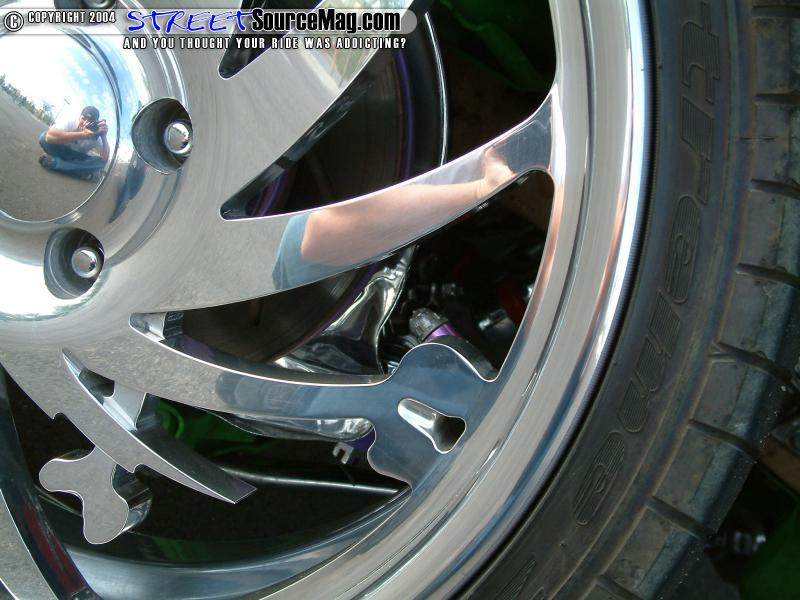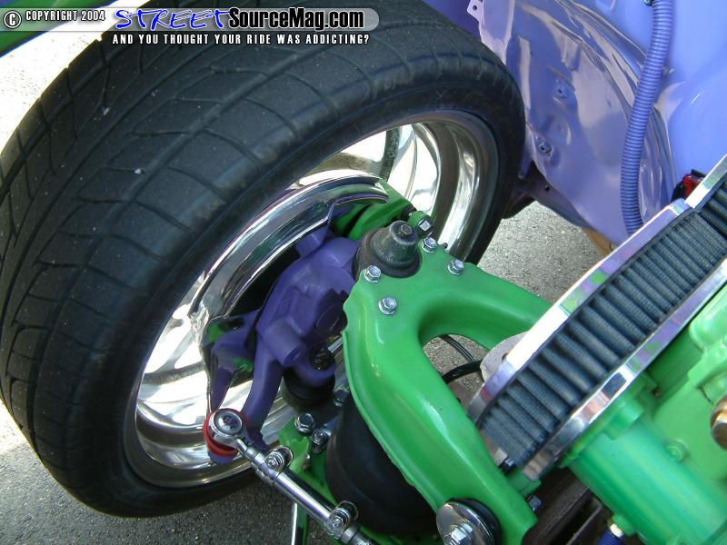 The battery would also need to be moved under the bed and in the place of the stock battery Charles would install 2 Stinger batteries. With the new drop many items would be moved and reworked to fit the new 18-inch B.A.D. Bone yard billet wheels wrapped in Nitto tires while the rear would be tubbed to fit the 20x8-1/2 wrapped in 255-35 Nitto tires.   Behind the wheels you will also find a custom slotted disk brake kit from Downey Off-Road and the fluid finds its way via the newfound stainless brake lines.