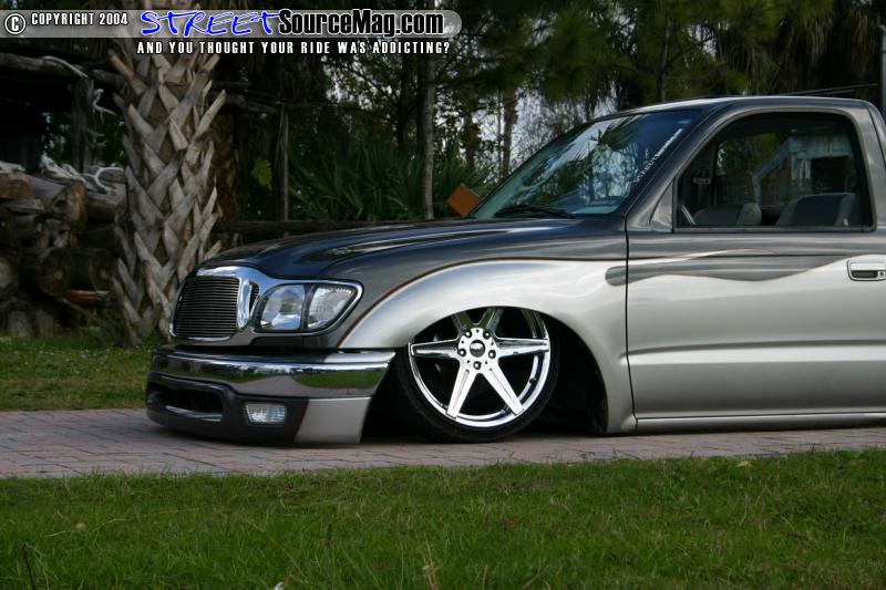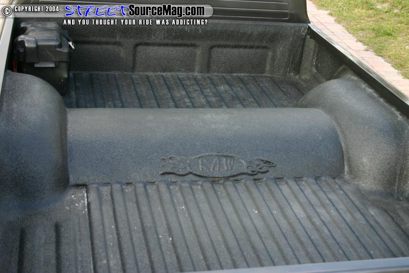 For ups, Firestone 2500 bags would be installed at all 4 corners. Not yet low enough for Tony's taste, Shaune would then need to move the master cylinder up a bit and relocate the battery into the bed for the 4-inch body drop. The firewall would then be tubbed to allow more room for the 19's. After layin' rocker this beast still has A/C, which is a necessity for every day driving in Florida. Finishing the bed set up and suspension, a molded notch cover with RAW logo would be added and sprayed over by a Linex spray-on system.