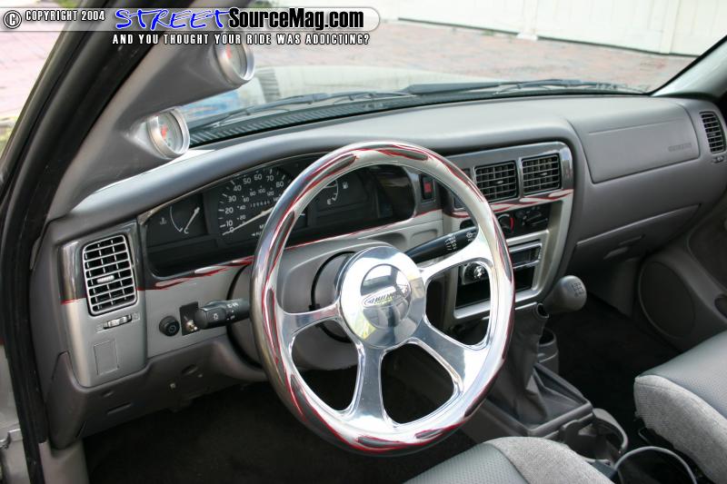 A RAW one piece molded gauge pod housing a set of Autometer air gauges is found in the driver pillar. For tunes on those long daily drives, a Kenwood MP-522 MP3 player installed into the dash. The interior paint would be handled by RAW and the wrapping done by Tony. Keeping the engine clean and simple, Tony would change up the alternator and have it boosted to 120 amps to handle the stereo and battery charged needs for the suspension. A polished intake is then found installed for that clean look and added performance. Thanks goes out to his boy Shaune Lewis who handled the fab work on the truck, Corey who started the body work and Anthony Rhodes who finished the paint and bodywork, Troy for stressin', mom for stayin' up late the week before Blooddrag for the seats, Kenny for makin us laugh and to ME (Garrick) for tryin to keep him laughin all weekend knowing what he was dealing with. And last but not least to all his club members of Relaxed Atmosphere!