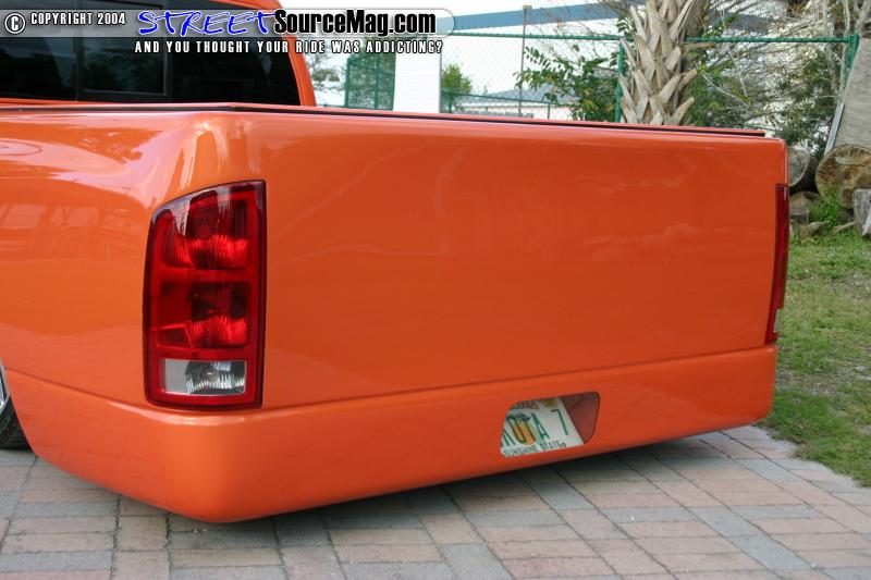 Taking on the sides, the emblems, door handles and antenna would all be shaved while the gas filler door was relocated into the bed. The taillights would be junked and a set of 2004 Dodge Ram tails would be fitted in their place. The mirrors would be shaved and replaced with a flamed chopper style mirror to help finish off the side work.