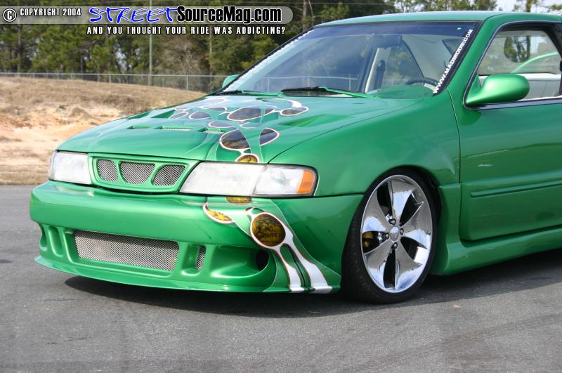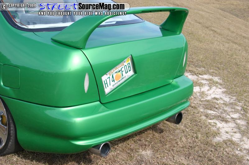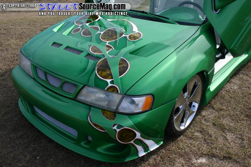 Along with the shaving Rob decided to do away with the antenna, and license plate and to french the license plate. Next a set of Lamborghini style hinges where installed, as well as a flip-flop trunk kit, and clamshell hood. Next Mad Mods would lay down the Electric Lime green custom paint, and then set it off with custom tribal and airbrush work. With all that work done to the body, Rob was now ready to send his car in for some stitching.