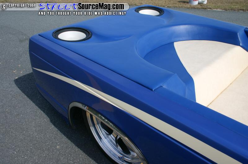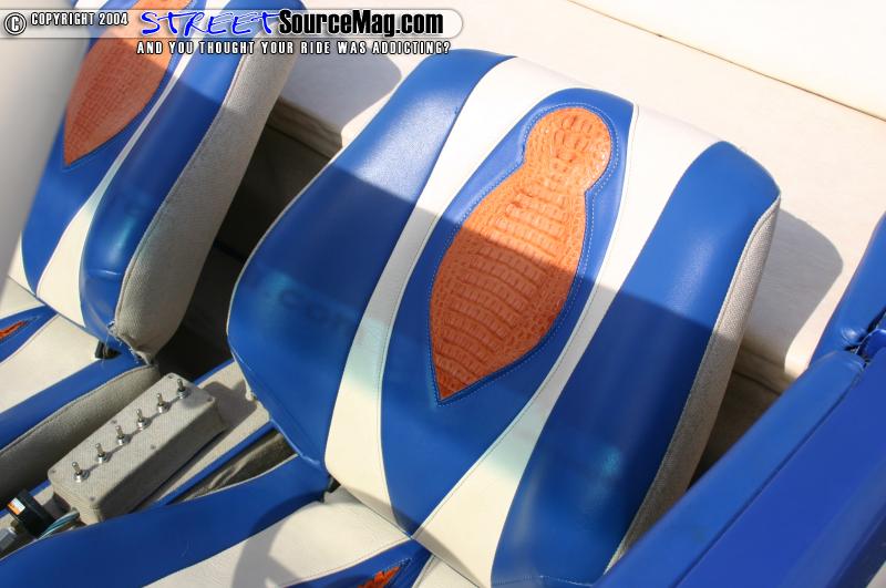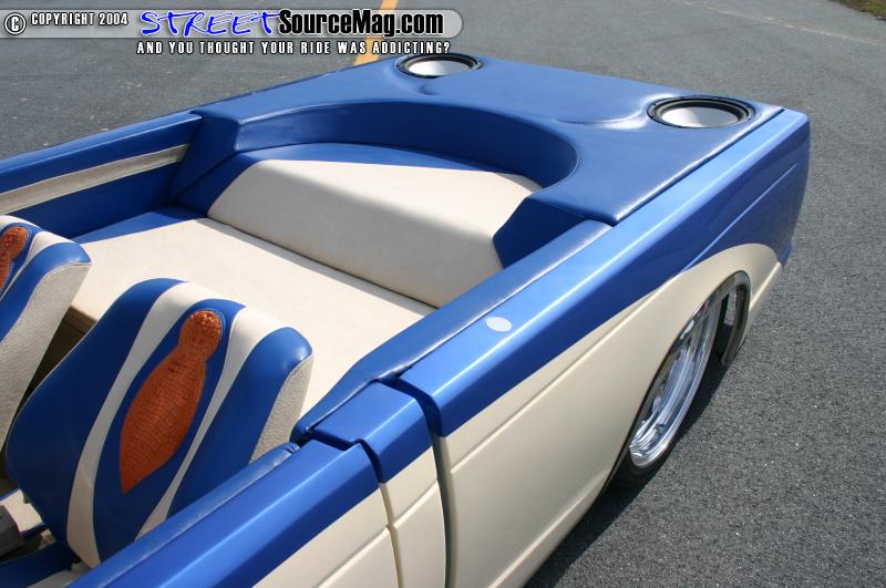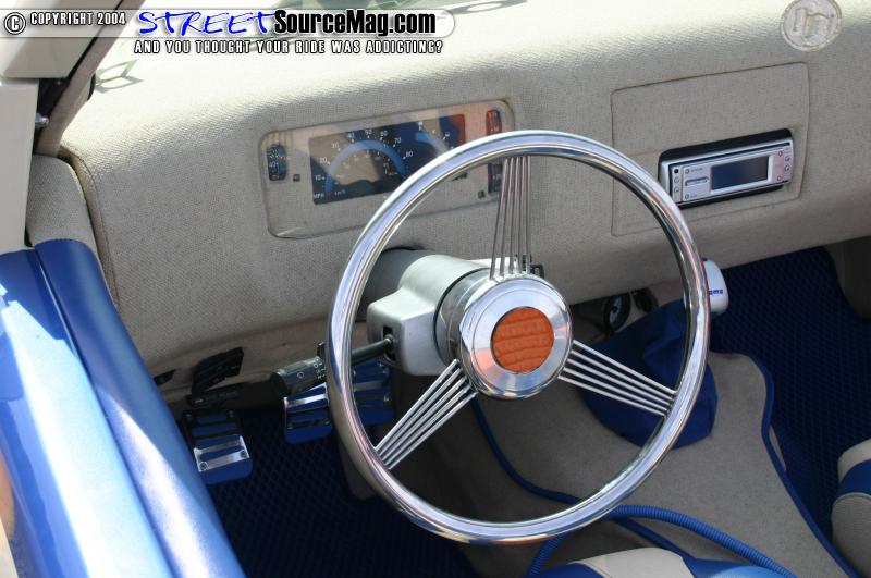 The seats where covered in blue and cream tweed, vinyl and gator skin inserts. A Grant Banjo steering wheel was bolted up. Tito gets his sound and video from a JVC touch screen headunit, the bump and vocals are provided by Phoenix gold 4ooWatt and Alpine V-12 2ooWatt amps, Boston Acoustic mids/tweets, and 12” Infinity subs.