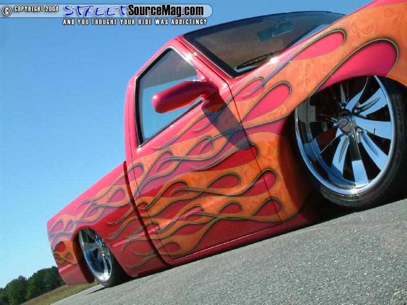four RS-72 Slam Specialty bags, 8 nickel plated GC Valves, 2 VIAIR 450’s filling the air tank which would be the frame holding up to 7 gallons. Stainless steel airline would then be ran throughout. Not yet finished they would then build a custom cross-member for the air ride housing an “SNC” flush molded with an orange lens and then striped in HOK lime green as well as the logo being a light. With the suspension in place the S10 would now tuck the 20x8.5 Chrome Boyd Coddington Turbines with 245/35R20 Nitto tires.