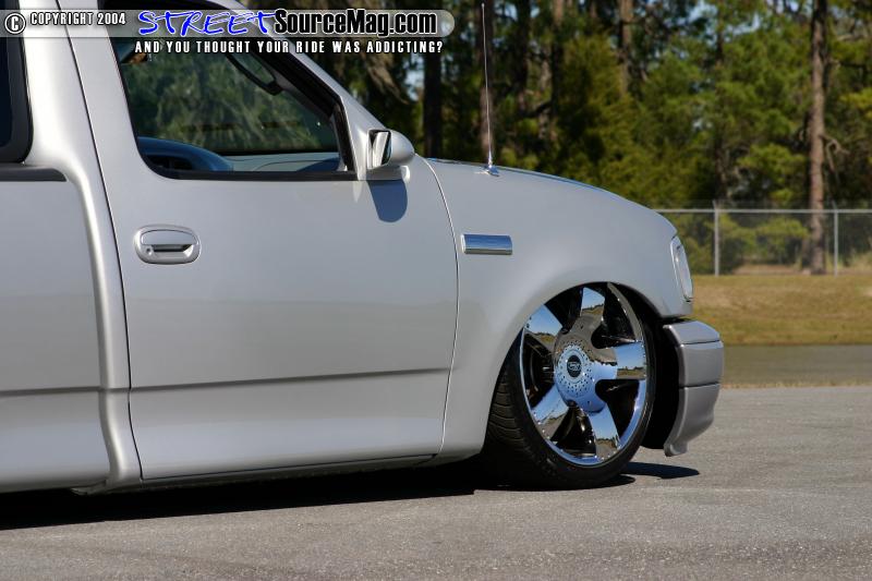Matt’s F150 rolls on a notched frame by Bulletproof Fabrication and air bags on all four corners, and features nitro drop shocks, notched firewall, and a 6 link canti setup by KD Components. Matt’s truck airs up courtesy of an engine driven compressor. The battery was relocated under the bed and the stock gas tank was sectioned to fit. Matt’s truck tucks the massive 22” KMC Thunders.