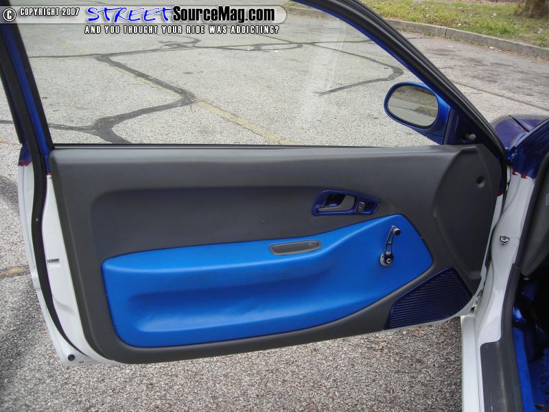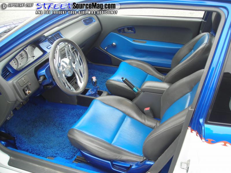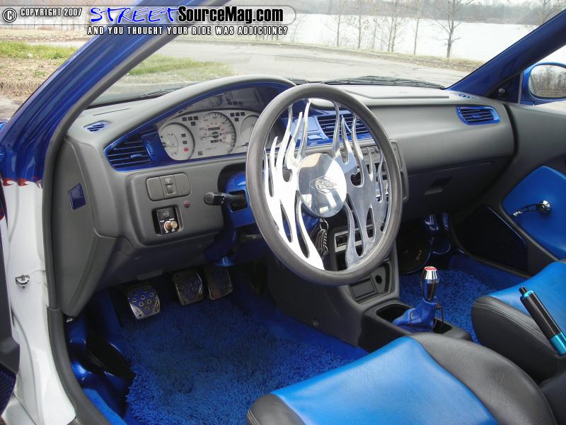 One of the first stops for this Civic was Garrett Upholstery in Van Buren. There the seats were recovered in blue & gray marine vinyl. The door panels and rear deck were also covered to match. Some blue matching carpet was then laid down and Steve Rogers of S&L Body Shop made some final touches with his spray gun. Some of the accessories added were an Indiglo blue gauge overlay, billet rearview mirror, billet window cranks & flamed Inferno billet steering wheel from B.A.D.