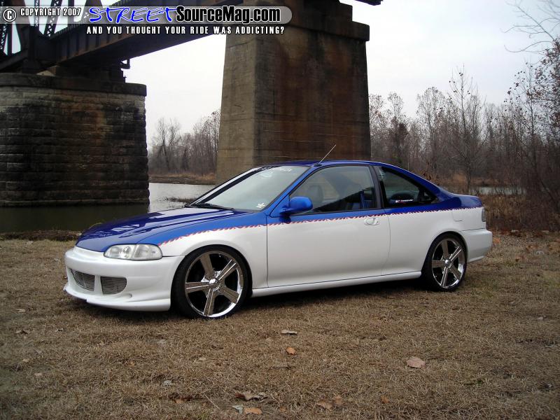 After several days of prep work by Tim and his partner, Steve Rogers was brought in to spray the Pontiac G6 blue and Honda white two-tone paint. Tim then broke up the colors by adding orange tribal graphics between the colors. Once all the paint and buff work was done, the exterior was finished with a sunroof, cat-eye style headlights and altezza taillights.