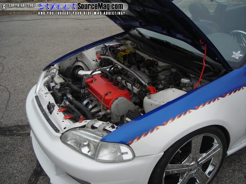 Not wanting to leave anything untouched, the engine bay also received some custom touches. A chrome cold air intake feeds the motor and Eagle rods and pistons were installed along with ARP head studs. A Pro 1 4-to-1 header feeds all the exhaust to a 4” OBX muffler for a nice deep tone. Then the valve cover and other assorted items were sent in to get some orange powder coat. Tim also added several custom stainless accessories. The front chassis was stiffened with a brushed finish strut bar and Pro 1 rear drop coils were installed to level the stance.