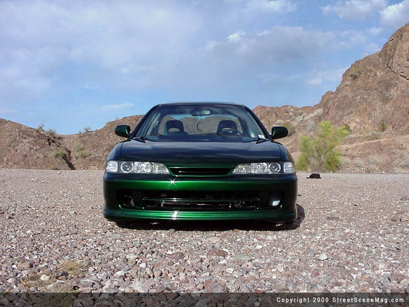 At first, Brian was going to go overboard and have a tube frame made along with air bags. He even went as far as getting a time booked with a shop from Cali to get it all done. But after his car kept getting off back because of the conflicting schedules, it gave Brian the opportunity to weigh out his options. So, the search began for a painter. Brian talked to several shops and even had a little work done by an independent guy out of his house. But a final decision was for the crew from Iron Art Industries in Glendale Arizona to handle the exterior. Chris "McGyver" Jannasch, a friend of Brian's who worked as a Honda tech and now works for SRD as head mechanic, was there helping with the entire project. They call him McGyver because he can do anything and always manages to pull some crazy shit out of his ass. The first thing that was done was to strip the car down to a rolling unibody. With nothing in the engine bay, no interior or windows, Brian's Integra was off at Iron Art in Glendale, AZ. They know their shit and did their best to keep Brian happy through the whole "ordeal". Iron Art first smoothed out the curves of the body. They shaved the handles, moldings, front license plate box, third brake light, emblems, trunk key hole, inner taillights and antenna. The rear window defroster now works as the antenna. Iron Art also mounted the side markers flush in the stock location to add the finishing touches. Now completely shaved, it was time to spray the House Of Kolor Organic Green paint. The project was not the smoothest, but Iron Art busted ass and the exterior came out beautiful.
