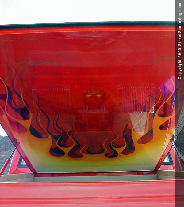 The crew from Carefree then laid a Kandy Tangerine by House of Kolor, over the entire truck. Next, they added the triple flames using white, yellow, orange, two different reds and purples, all from House of Kolor. The pinstriping was done with green, purple and blue applied by Wizard. Other notable exterior accessories include the Trenz grille insert and clear tails. In order to roll around to the shows and keep the engine looking as good as the rest of the truck, Jeff applied a few upgrades. A new water pump, alternator, pullies, valve cover, injectors, air cleaner and intake system all by Street & Performance were installed. Lots of chrome plating and polishing fill the engine bay while everything else is painted with flames and skulls visible throughout. A Boag exhaust system was also added to beef up the performance and sound of Jeff's V8.