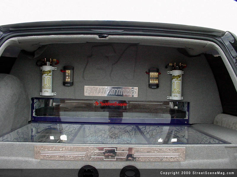 It’s not a true show vehicle till you have the interior complete with some kick ass tunes! Having the know how to do both made this task a fairly easy one for Fabian. When you open up the doors of the Suburban, the first thing that pops out at you has to be the entire selection of billet and the big ass stereo. The dash has billet accessories by Empire Motorsports hooked up everywhere possible along with a custom billet steering wheel and rearview mirror. To accent the billet, the interior panels and seats where wrapped in gray tweed. All the interior billet and upholstery was done by Fabian himself. Finishing up the interior Fabian decided to break something off proper like with a thumping stereo. Units of choice, a Sony CD player and EQ. For speakers he chose Rockford Fosgate subs, mids and tweets ran by 7 Rockford amps. And to keep the current flowing he installed to Optima batteries in the rear. Install was all done by Fabian himself, and I must say it turned out kick ass! Fabian would like to thank all those from his club Explicit Attitudes and close friends for their help in constructing this phat ass ride.