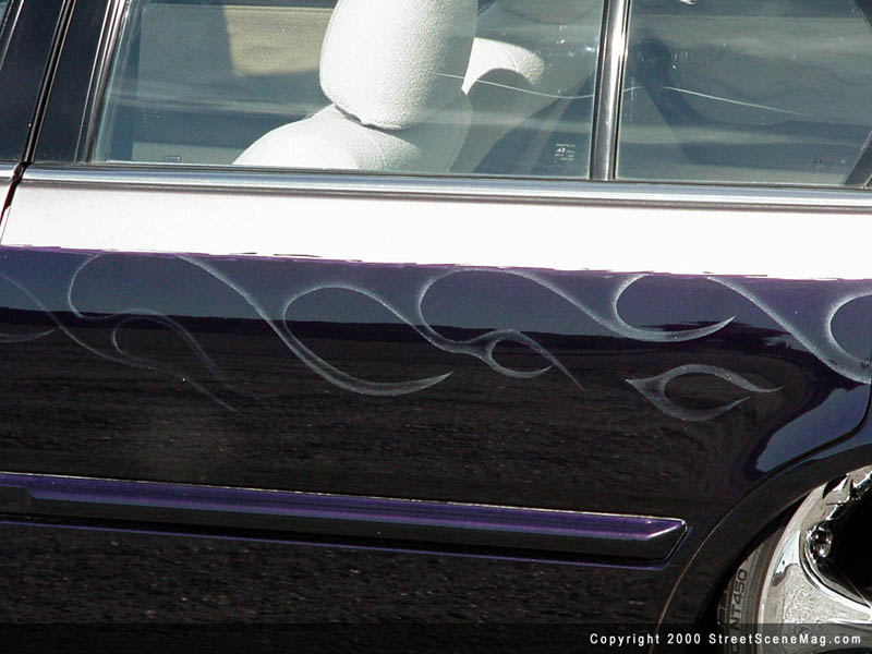 The license plate box in the trunk lid along with the license plate holes in the front bumper were next and the molding followed suit. Troy, always looking for the one-off idea, decided to custom mold the front grille and add his own personal touch. Other notable bodywork is shaved hood squirters, antenna, and the seams under the smoked taillights. Troy himself performed all of the bodywork. After removing the car of all unnecessary items, it was time to apply the paint. To do this, Troy went to Ray Bice of Glamour Works in St. George, Utah for help.