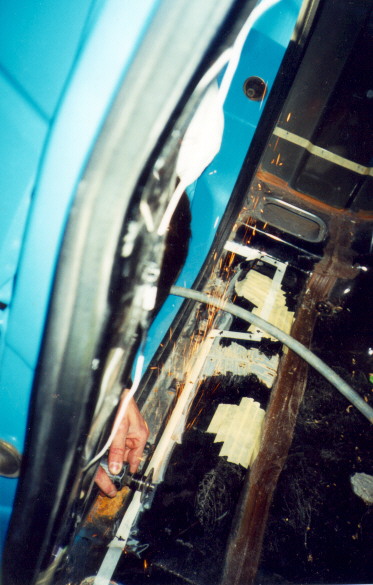 The lines are made with various corners & turns to keep all seatbelts in the stock positions. Here is the section of rear cab wall that is removed & butt-welded back together. To get the floor cutting started, a cut off wheel is used to give the recipro a starting slot.