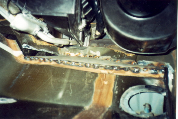 Then we move back to the firewall, where we begin tacking it up. Here is the driver's side completely welded up. Once we are satisfied that we have it all welded up, we seal all the welds with autobody seam sealer.   Next, a good coat of paintable undercoating is sprayed on everything to keep rust from starting.