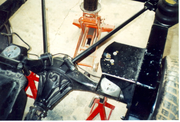 Next, check the measurements you got earlier and adjust if necessary.   Now for the upper bars, try to keep them as long as possible to keep the pinion angle change to a minimum. Keep your worst pinion angle at the point where the truck will be at it's lowest. This will give you a pretty good angle at any of your driving heights. At ride height, the pinion angle should be between 1 - 4 degrees max, but never zero. Take a measurement to determine the new rear crossmember location and tack it in place. Measure your rearend side to side again to be sure you are still ok and put the upper bars into place and tack them.
