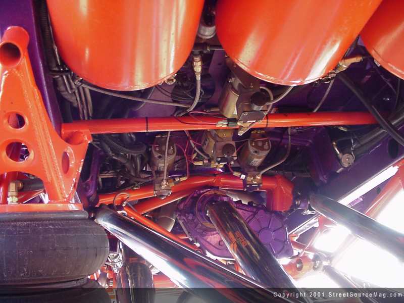 To provide the lift, four large, heavy-duty compressors were installed to fill the three two gallon air tanks. To assure quick lift, 16 EAI ½" port solenoids were installed, allowing quick release of the stored air to fill the huge air bags found beneath this huge Excursion. Helping the overall ride, 2 ½" Sway-A-Way shocks were installed, two per wheel, along with Sway-A-Way hydraulic bump stops. With a vehicle this large, you have to do whatever possible to prevent sway. Keeping this in mind, Craig's decision was easy. His choice was to install 1 ½" front and rear Sway-A-Way power bars.