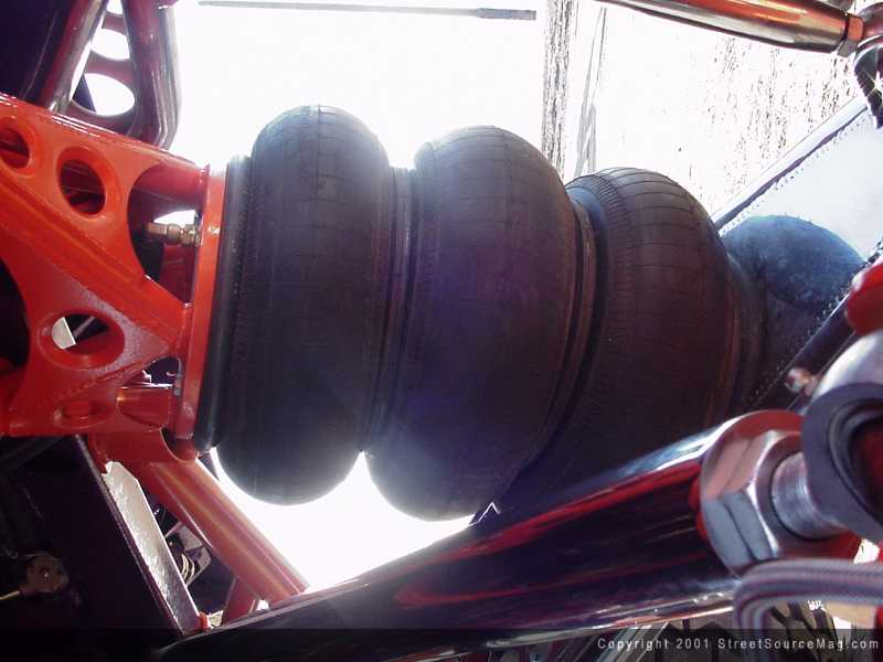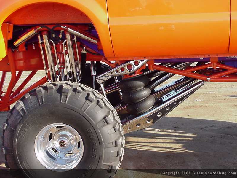 Now that the basics were out of the way, it was time to introduce a new idea to the 4x4 scene. For starters, a custom 2-½" four link along with 1 ¼" QA1 heims joints with Meziere misalignment spacers and clevises were fabricated and installed. Providing less movement, an array of Energy Suspension orange bushing were installed throughout the entire undercarriage. Air bags mounts were then strategically fabricated, front and rear. Yep, I said bag mounts - provided by Air Ride Technologies. With the bags in place, Ride Pro digital gauges were installed in the cab to keep an eye on air levels at all time.