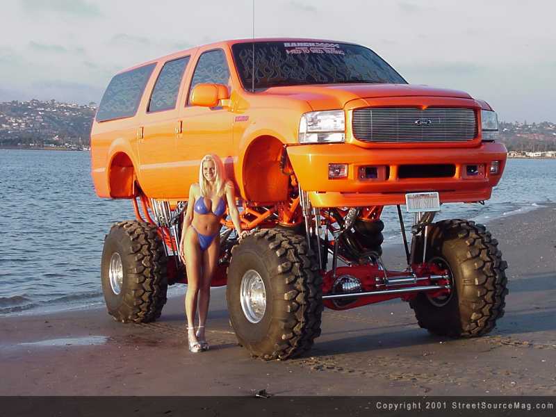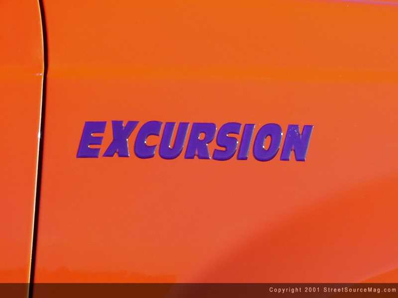 As with any ride, stopping is essential. But with a beast of a machine like this, it becomes more of a must than normal. To ensure stopping and turning ability with the 16.5x14 Outback Weld racing wheels, snuggled in 44x18.5 Denman Tire Super Swampers, Craig would turn to Aeroquip for help. To help manage this task, Aeroquip steel braided brake hoses and Boyce Equipment hydraulic steering lines were installed. Keeping the clean look underneath, Jim McGill at Ranch Muffler & Truck Accessories of Temecula, California was called upon to do the plumbing for the lines. To provide a few other touches of eye candy to the undercarriage, Craig contacted the crew from Street Glow Neon. You can find purple neon throughout Craig's Excursion, along with a touch of purple neon behind the grille. Karvision's of Temecula, California provided the wiring for the neon. If you look close enough, you can also find Craig's Grover Air Horn, providing heart attacks for the elder generation. MGM also supplied a set of plexi-glass mud flaps for an added twist to this custom.
