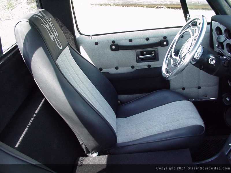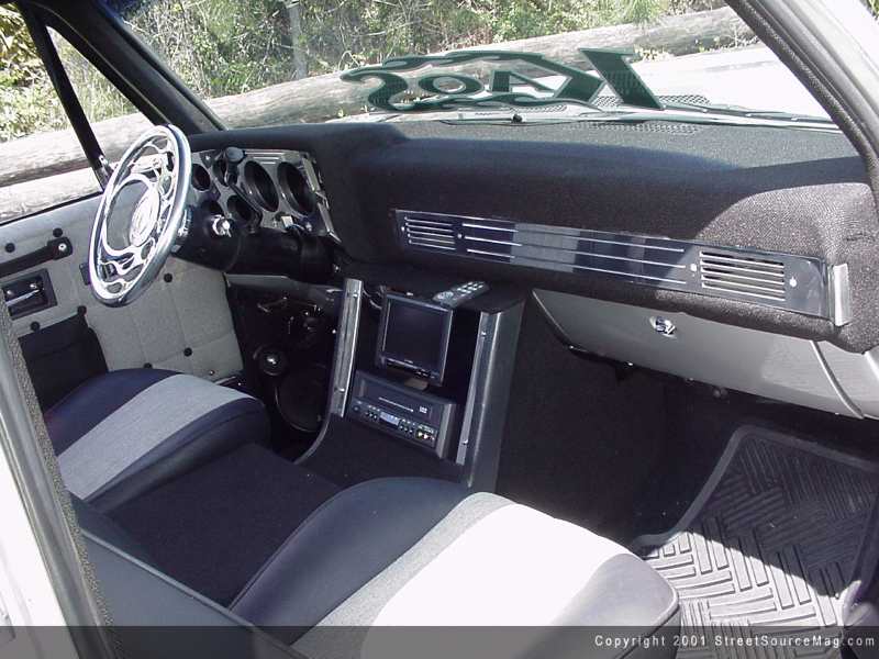 Finally, the captain's area of Bradley's Chevy needed to upgraded so the man himself could be comfortable while out cruising his trophy winning masterpiece. The factory dash was recovered in gray tweed and billet instrument panels were installed, giving the dash a much better appeal to the eyes. Also adding looks to this older model Chevy, silver and teal gauges from Brent Yawn Customz were installed. Seats from a Chevy Camaro were wrapped and installed, replacing the factory bench seat.