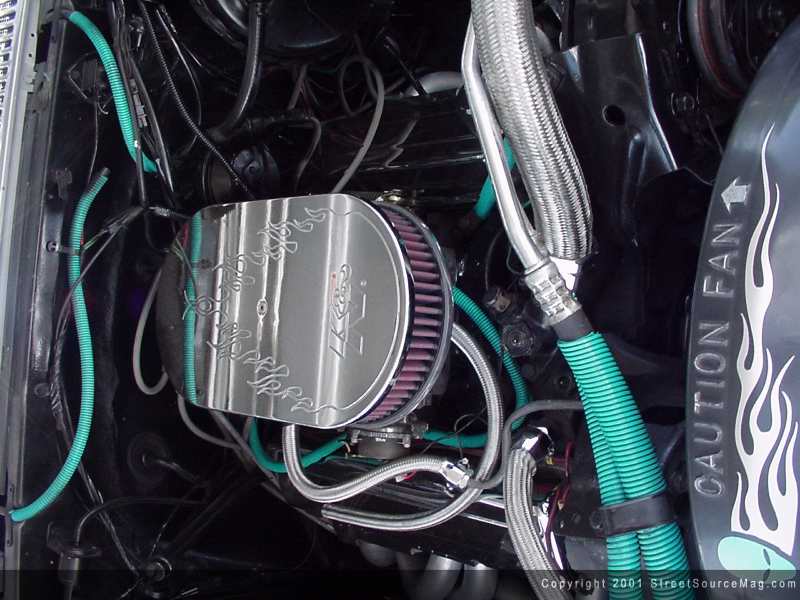 On top you'll find an Edelbrock manifold along with an Edelbrock 650 carburator. Sitting on top of that, Bradley installed a K&N Flamed air cleaner for bonus points. Polished Heddman headers were bolted up to the block, and from there, 2 ½" stainless steel exhaust allows the vapors to leave the engine, passing through a Flowmaster muffler. Tons of chrome and polished goodies, along with colored hose line and loom can be found throughout the engine bay of Bradley's Chevy, giving his truck plenty of eye candy under the hood.