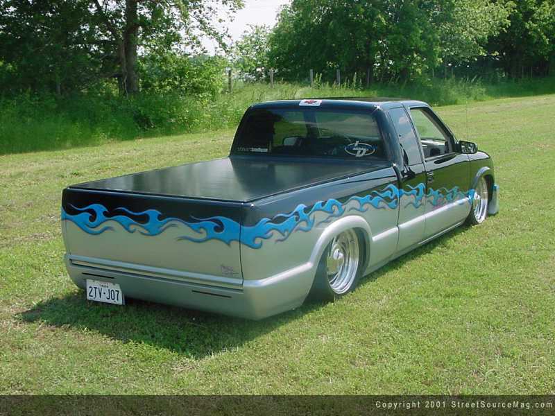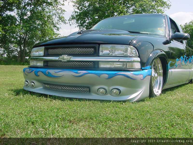 The front of the truck was coming along nicely, but something in Chris's mind told him that he needed something more to help the front-end get that "mean" look he was striving for. With that in mind, Chris covered the tacky stock bumper with a Street Scene bumper cover, complete with pilot fog lights. Now that the front-end looked clean as hell, it was time to take care of the rear-end. With help of Sean at Phat Rides, Chris cleaned up the rear of his S-10 by molding in a custom rollpan with LEDs and shaving the boring factory taillights and tailgate handle. Soon after the bodywork was complete, it was time for Chris to add some paint to his slick S-10. Needless to say, Chris wanted something that no one had ever seen before, so he handed the truck over to Max Maxwell of Maxed Out Paintwurx, Before he let Max unleash his skills of design, Chris gave his wife a chance to come up with a concept that they both would enjoy. She came up with a great idea, using tribal flames as the main concept.