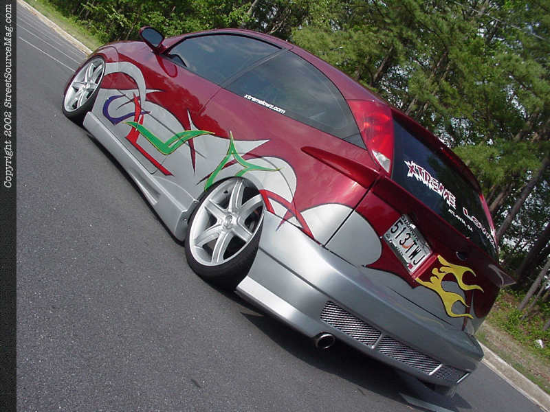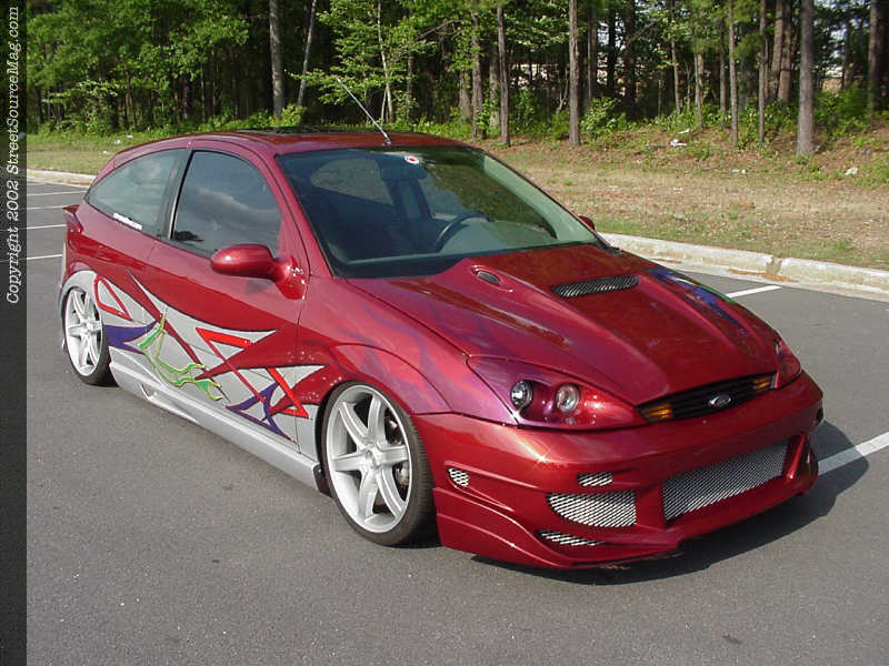 Under the hood of Howard's Focus, many things were changed to give the little four-banger much more power than stock. First, Howard ported and polished the heads of the stock engine, and replaced the internals with stronger units such as Crowler rods, JE Pistons and a new camshaft courtesy of Web cams. Howard replaced the stock underdrive pulley with a model from Esslinger and added a Ford Motosports intake manifold, as well as AEM intake. If the new mod's weren't enough, Howard also installed a 150 shot direct port nitrous system from NOS and then used a Diablo Sport Chip to allow the car's computer to utilize the new engine modifications to the max. In the rear, Howard's Focus can breathe easier thanks to 2 1/2" Borla cat-back exhaust system.