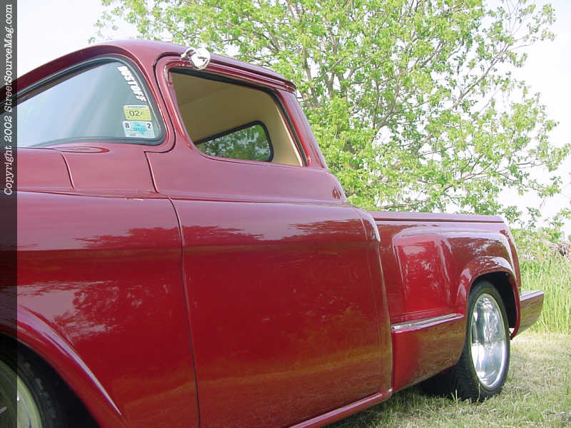 Adding to the body modifications Billy had the top of this 58' chopped 3" and custom glass installed to accommodate the chop. With the cab and fenders taken care off Billy decided to junk the factory bed and go with a 90's model step-side bed and adding to this Billy molded in a ZR-1 roll-pan, billet specialties step plates and a relocated gas neck behind the flip down license plate.  Once the bodywork was finished Billy had Legacy Paint and body of Garland Texas lay down the fire mist red paint in excellent fashion to bring this truck to life.