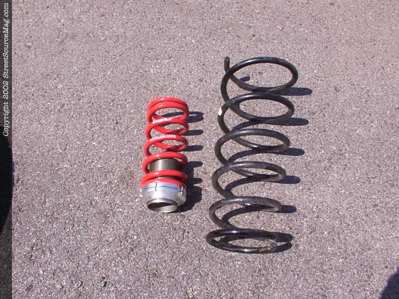 Remove any tie rod end or steering arms that may be attached to the strut. You also need to remove any brake like brackets. Now remove the bottom two bolts that mount the bottom of the strut to the hub assembly and remove the entire strut and spring assembly from the car. Remove the factory spring and all rubber bushings from the strut. Also remove the strut cap; this can be done using a flat screwdriver and a hammer. Here is the difference between the factory spring (right) and the coilover (left).