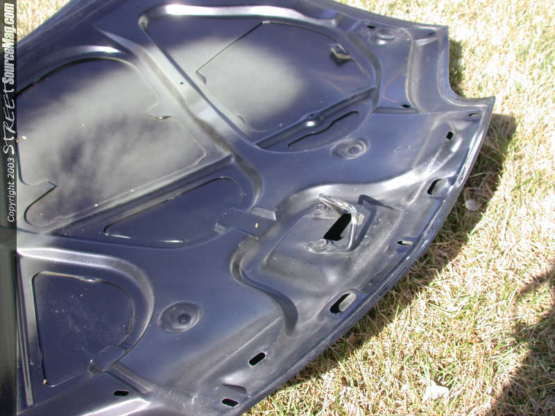 The first step of installation on the beast is to open the old hood and remove the bolts holding the hood on the hinges. I'd grab a friend to help you cause this is a pain to do by yourself, trust me I know. In this picture (below) you can see the hood removed showing the Z24 2.4L engine. Now, lie the hood down on a soft surface so you can remove the hood latch from the old hood (we need it for the new one).