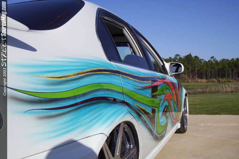 Once Allen had the Civic ready for paint he laid down numerous coats of Honda Olympic white paint to the body. Once Mitchell picked the car up from Allen he noticed that the plain white hue was not going to make the car stand out enough in the crowd so he called upon the artistic styles of William Boswell at Wild Airbrush in Columbus, GA to lay down the multi-colored airbrush theme over the entire body of the Civic.