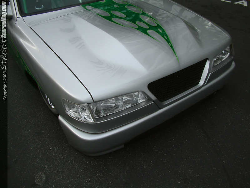 The stock headlights were junked and in their place Josh molded in a set from a '97 Accord. The taillights where then shaved and replaced by ½ inch plexiglass with the lights located behind for braking visual.   The bodylines had to go as well as the vents found in the cowl. Custom mirrors help bring things together before the paint is laid down.