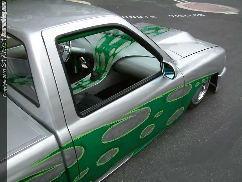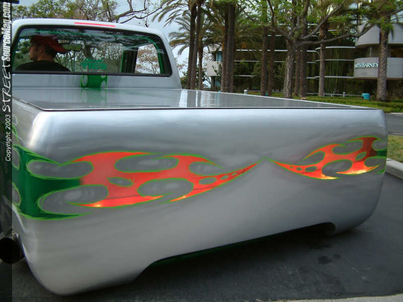 The marker lights in the front bumper where shaved along with the bumper and valance being molded together. The rear bumper was a creation of Josh's own, like most items found in this build up. The door handles were shaved along with the gas filler door. Now to fill the gas Josh goes directly to the fuel cell located under the tonneau cover.