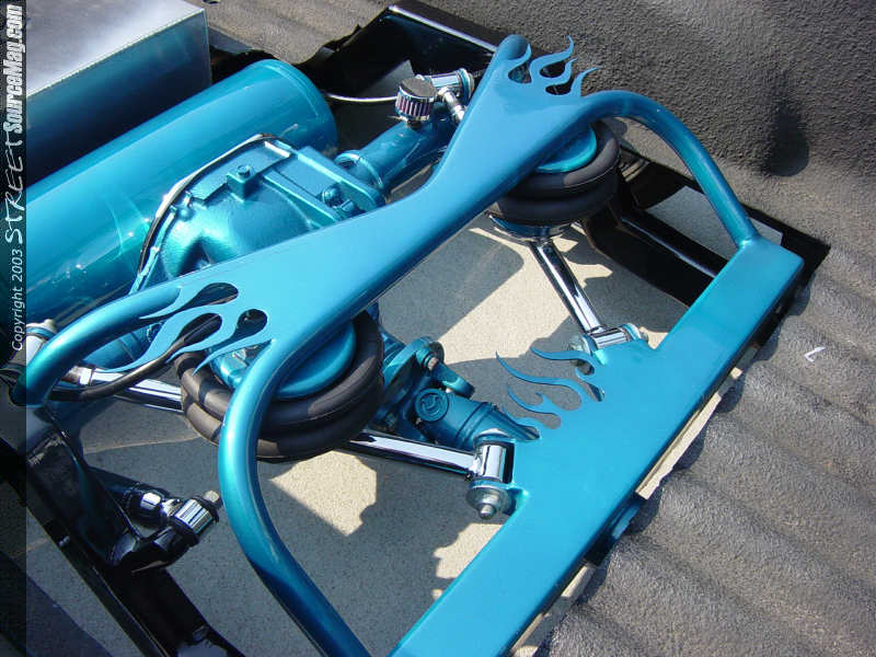 then paint the notch to match the truck as well as the drive shaft and rear axle. The rear paintwork was all performed by Denny. They also added a chrome Hack Shack 4-link to stabilize the rear end. Brackets were also welded to the rear clip to hold the air tank, compressors, ½ Parker valves and the red top Optima battery under the bed. A 15-gallon polished aluminum fuel tank was also added to the rear clip. To add lift to the rear a pair of 2600lb Firestone Airbags were bolted in along with a set of Pete and Jakes chrome shocks.