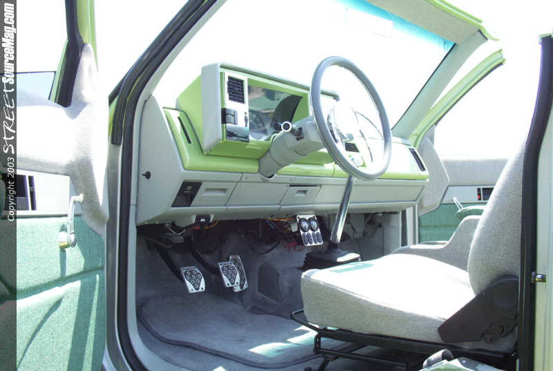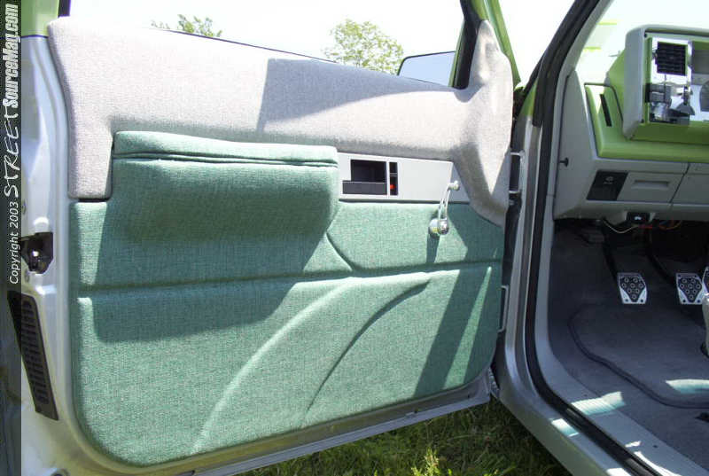 One of the final orders of business was the interior of the open air cruiser. Chico removed he dash and treated it to the same custom mixed Cyber Green as the exterior was treated to.   Moving to the seats Chico chose a set of Recarro buckets. The seats, door panels, and center console were delivered to the sewing skills of Auto Tailors in St. Peters, MO for them to ad a custom mixture of green and gray tweed.