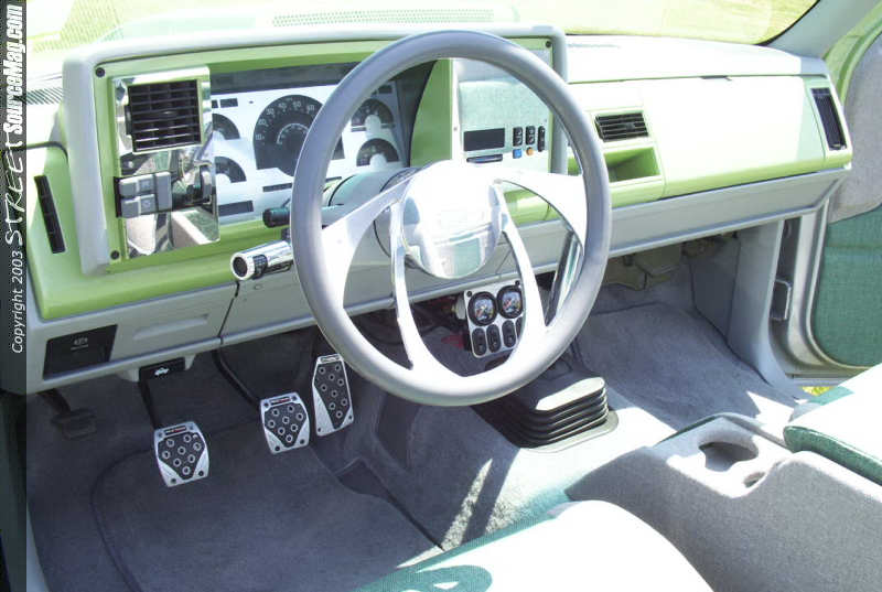 Once the freshly sewn items were installed a Billet Specialties steering wheel was used to replace the factory wheel. Other billet accessories were then added to accent the interior of the topless cruiser.  Not wanting to take long trips and have nothing to listen to Chico called upon the skills of Jason McGill to install the Blaupunk head unit and the Power Acoustic separates.
