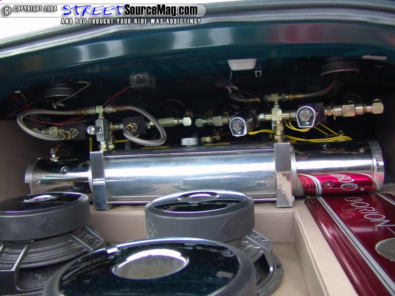 Back when Chad bought this car, he knew he was gonna make it into something that would stand out. The first thing Chad did was to strip out the stock suspension and go with something that would lay this car out.   For the drastic drop, he chose to go with a hydro set up. Not just your basic rough riding juice, Chad opted to run two chrome HiLo pumps with four dumps and a chrome whammy tank.